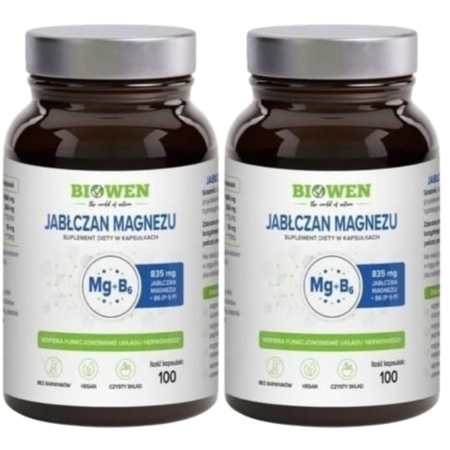2x Biowen Jabłczan magnezu 835 mg + witamina B6 (P‑5‑P) – 100 kaps. | Wegański suplement na stres, regenerację i komfort mięśniowyłek