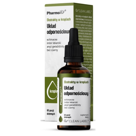 Ekstrakty w kroplach Układ odpornościowy to kompozycja 4 ekstraktów roślinnych (glicerynowo - wodnych) w kroplach. Echinacea, imbir, anyż i czarny bez pomagają w prawidłowym funkcjonowaniu układu odpornościowego. Dodatkowo echinacea wspiera działanie górnych dróg oddechowych oraz może wykazywać korzystny wpływ na gardło i struny głosowe. Imbir wspiera oddychanie oraz wykazuje właściwości przeciwutleniające. Anyż wspomaga naturalne mechanizmy obronne organizmu oraz może być pomocny podczas chwilowej chrypki. Bez czarny wspiera organizm podczas przeziębienia.