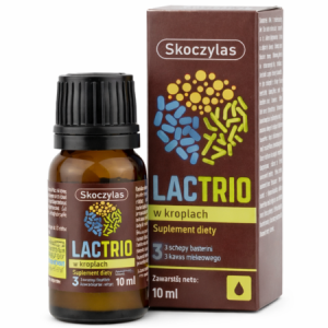 Skoczylas LACTRIO to wysokiej jakości probiotyk w kroplach (10 ml), przeznaczony dla dzieci od 3. roku życia i dorosłych. Zawiera starannie wyselekcjonowane bakterie kwasu mlekowego, które wspierają zdrowie jelit i układ odpornościowy, szczególnie w okresie antybiotykoterapii i zmian diety. Produkt bez konserwantów i barwników, w ciemnej butelce chroniącej przed promieniami UV.